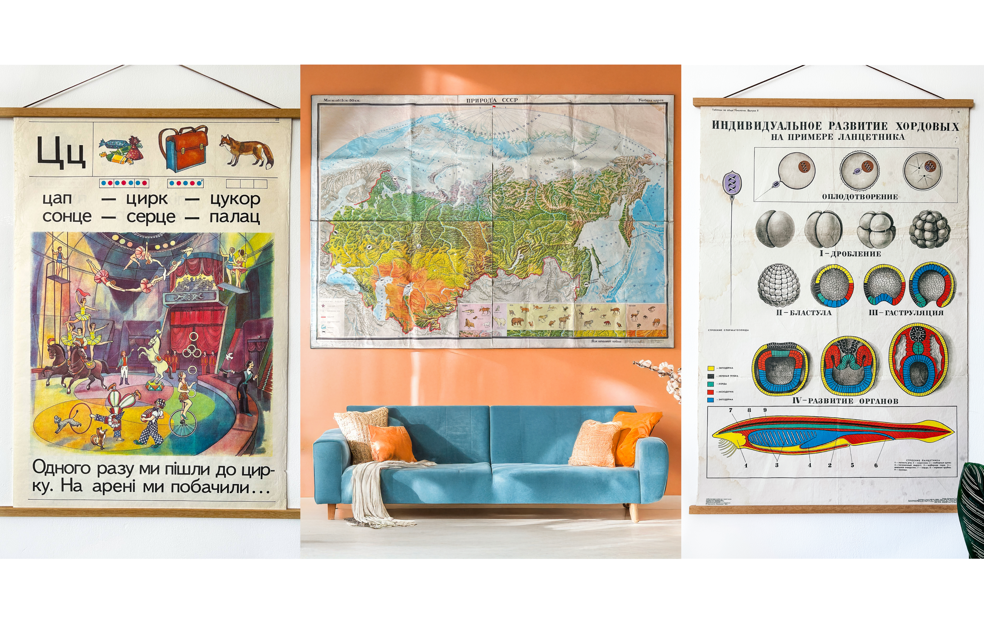 1968 Original Soviet Vintage Large Biology School Chart "Individual Development of Chordates, LANCET)" Paper On Linen, USSR Mid Century Educational Poster