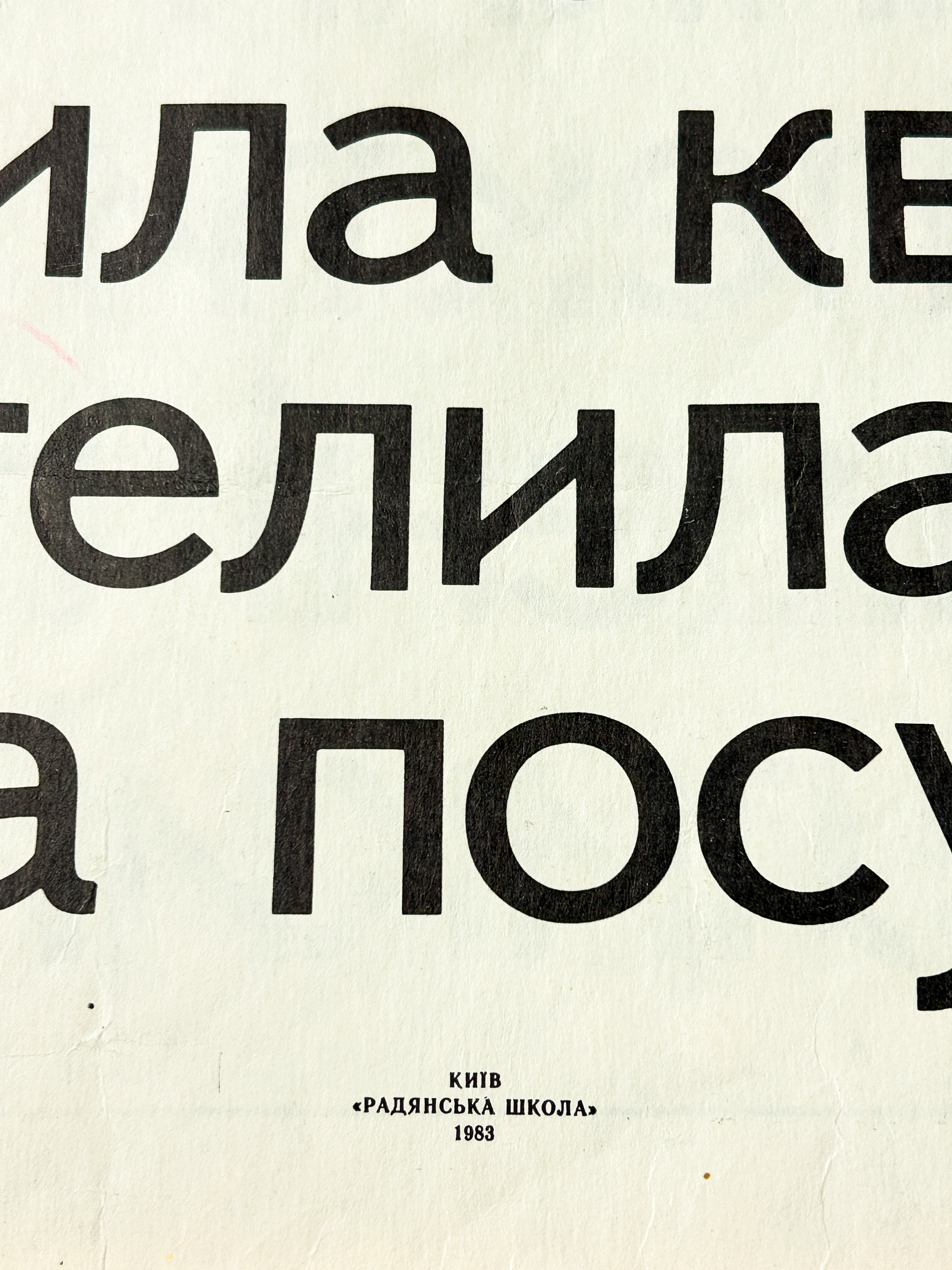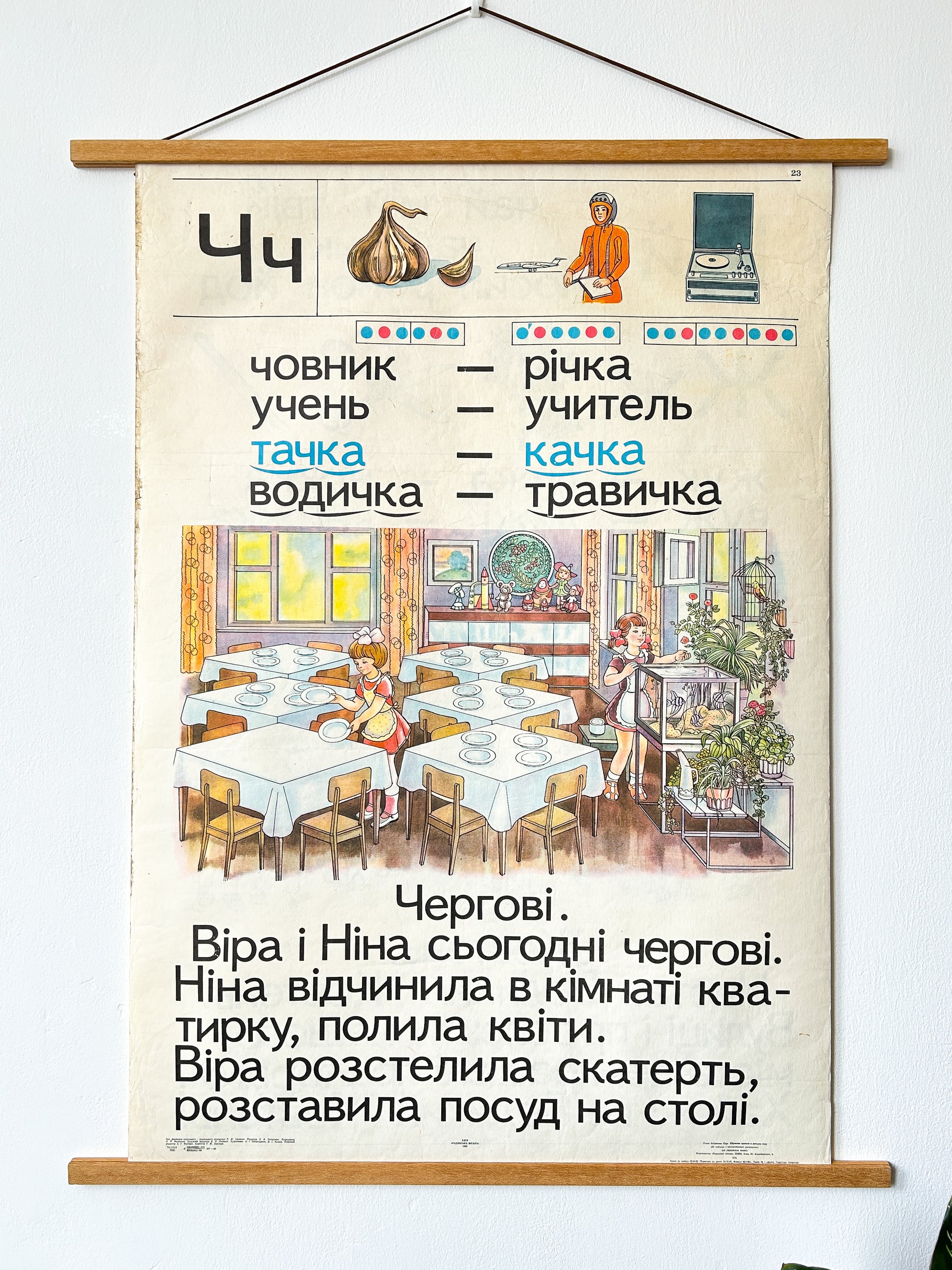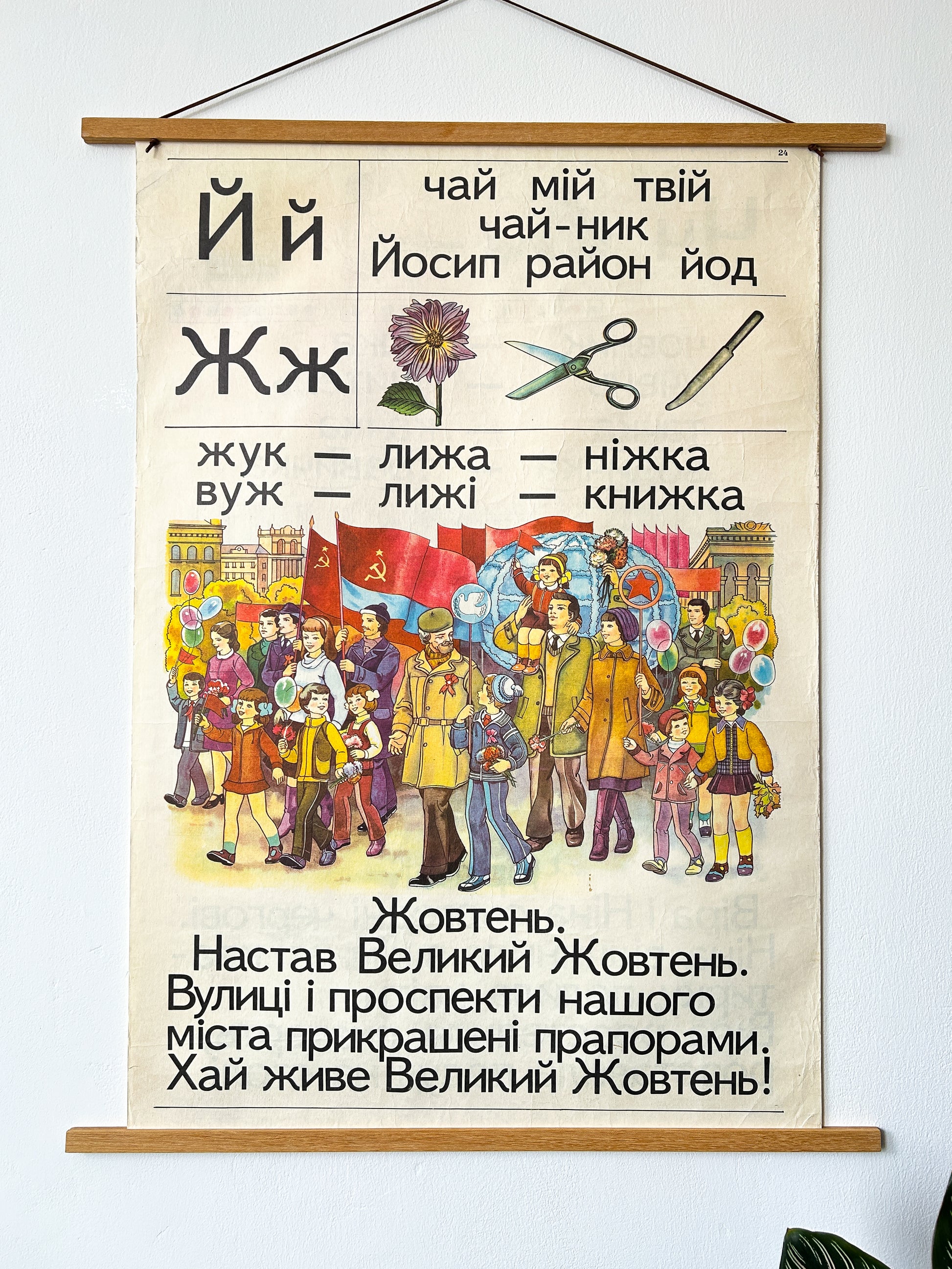 Large original double-sided Ukrainian vintage alphabet poster printed in Kyiv in 1983. A rare survivor from a time when the Ukrainian language was suppressed and replaced by Russian across the Soviet education system. This beautifully illustrated chart was used to teach the Ukrainian alphabet — a powerful artefact of cultural endurance and national identity.