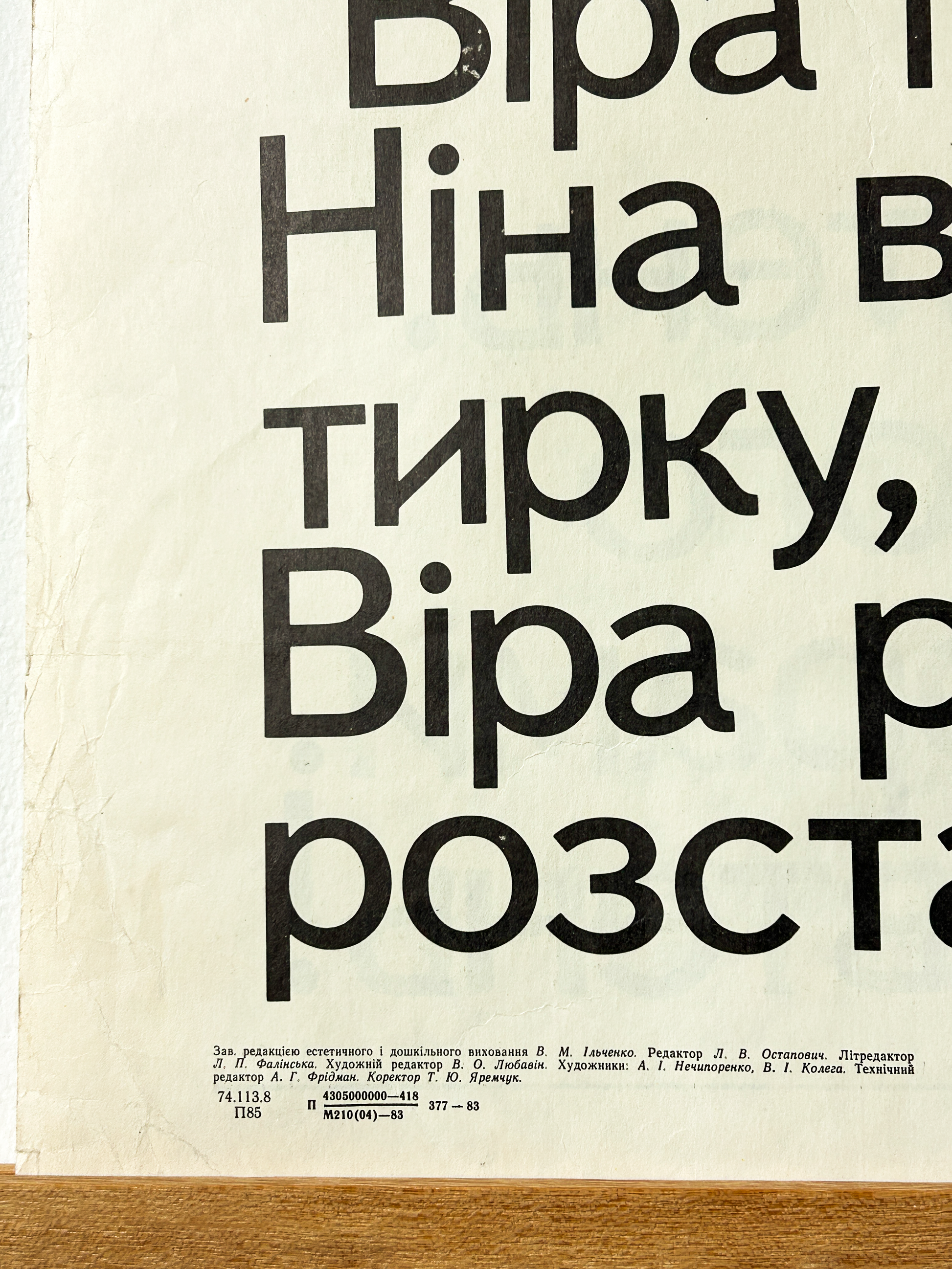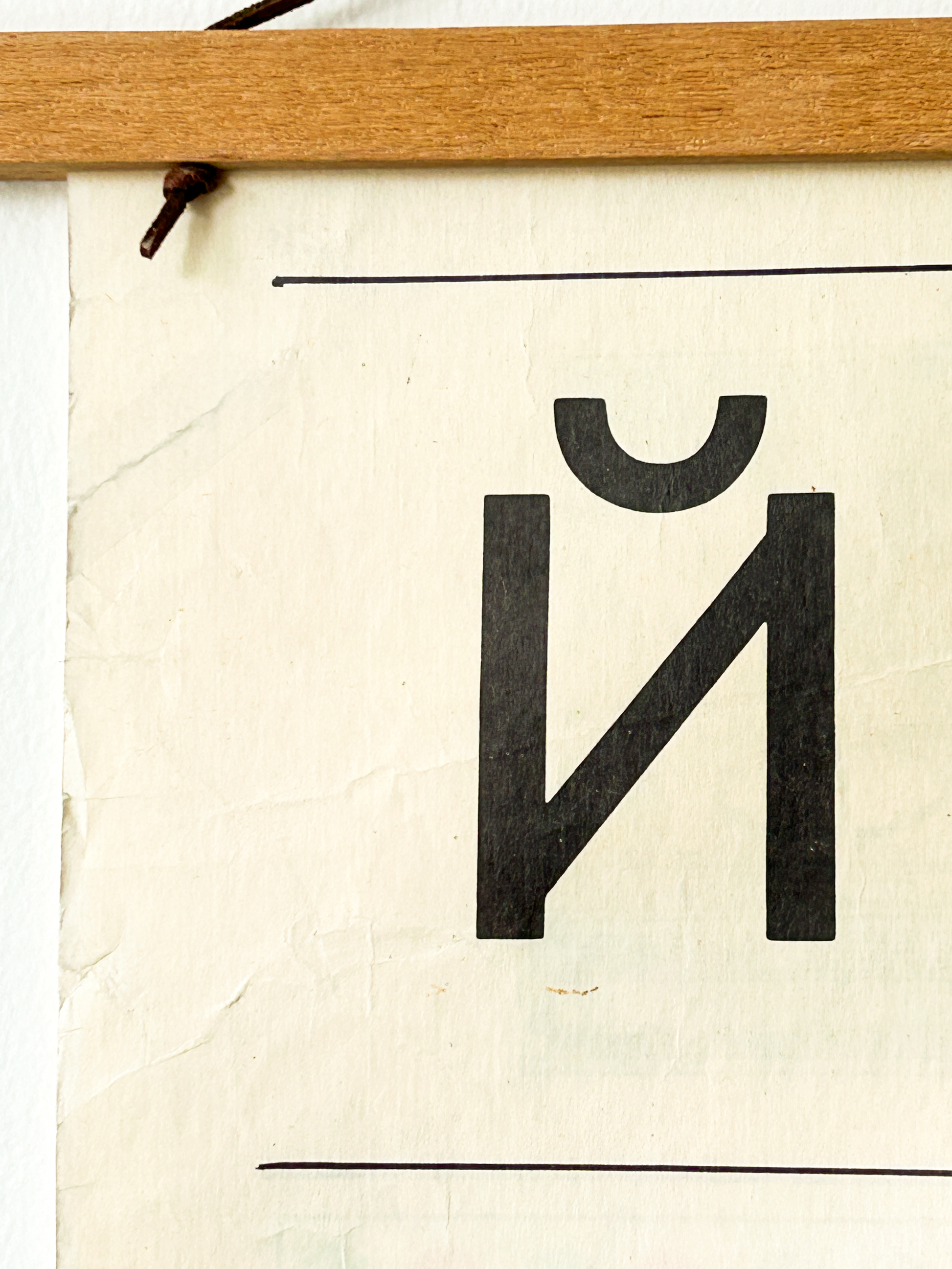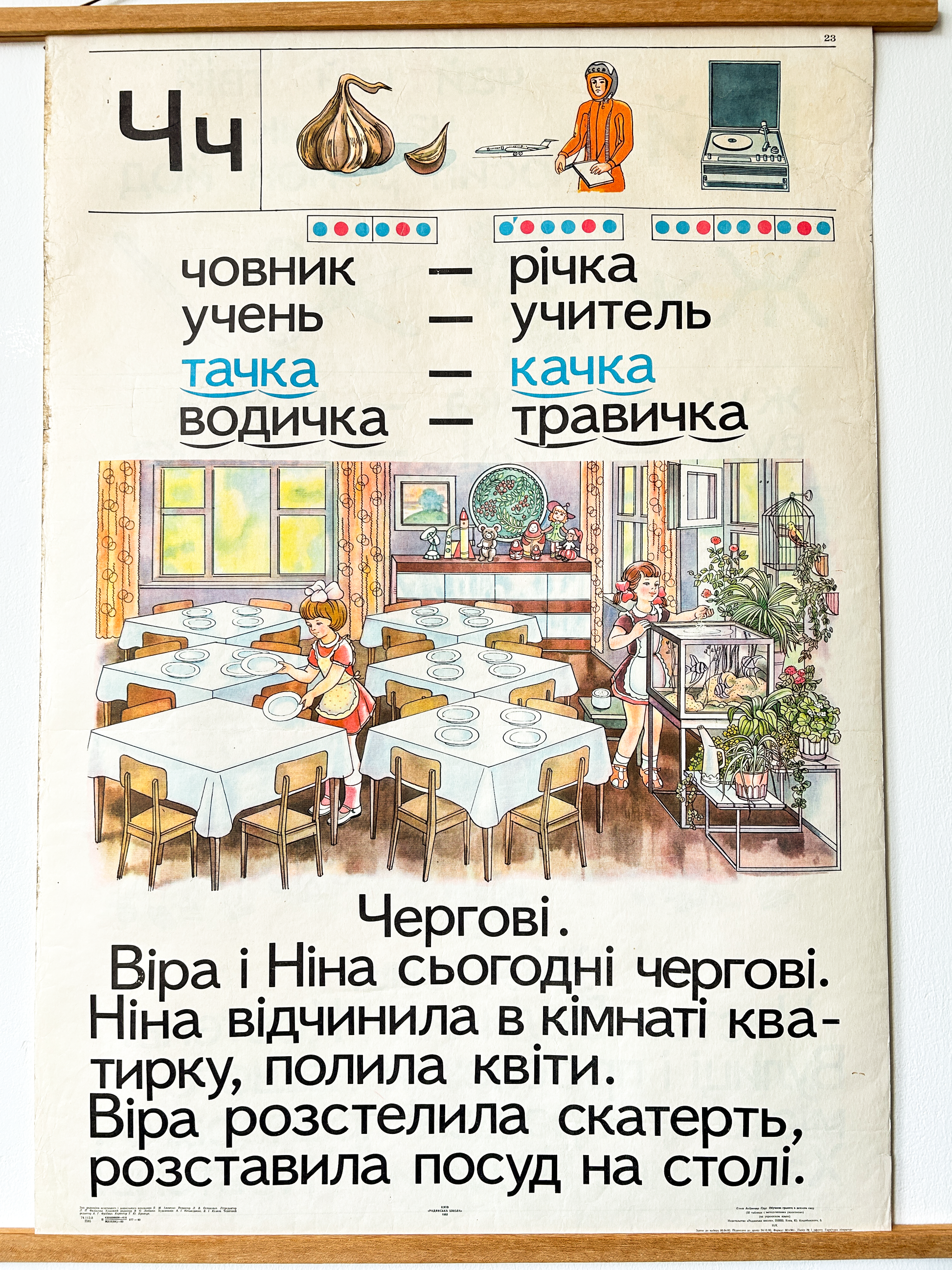 Large original double-sided Ukrainian vintage alphabet poster printed in Kyiv in 1983. A rare survivor from a time when the Ukrainian language was suppressed and replaced by Russian across the Soviet education system. This beautifully illustrated chart was used to teach the Ukrainian alphabet — a powerful artefact of cultural endurance and national identity.