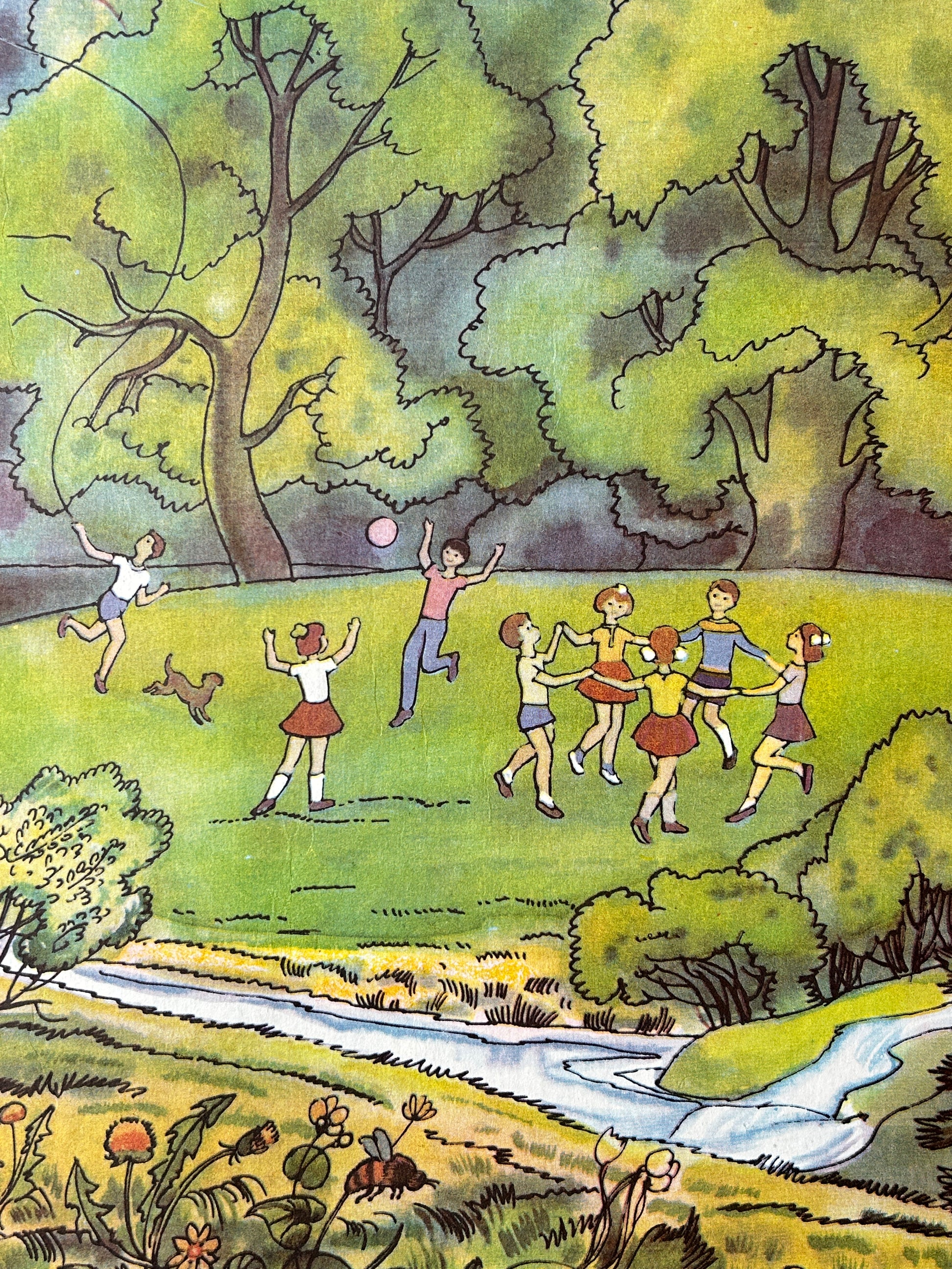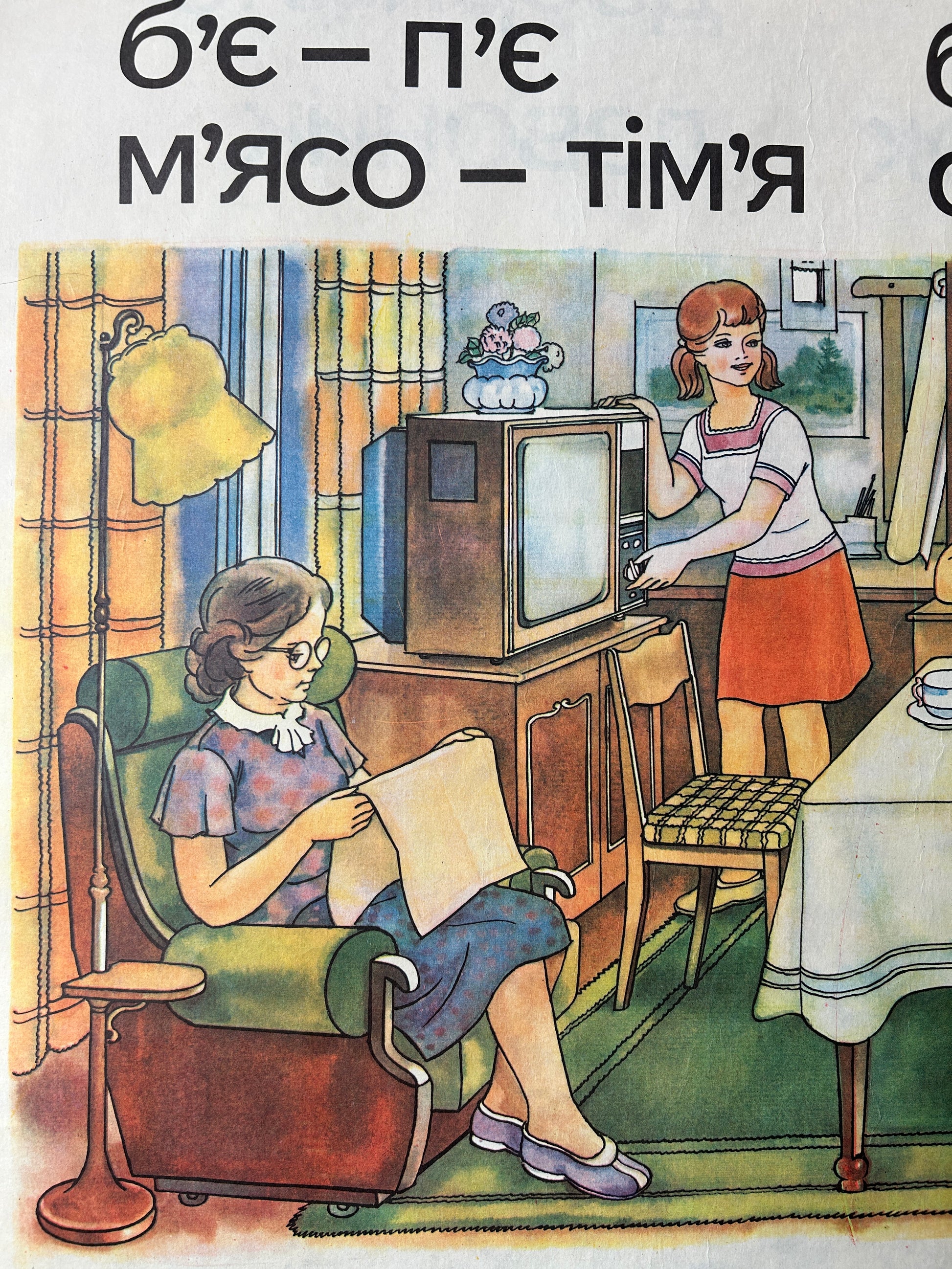 1983 Rare Original Ukrainian Vintage Double Sided Nursery Alphabet Poster: Nature, Kids, Bumblebees & Family Tea | Soviet-Era Educational School Chart