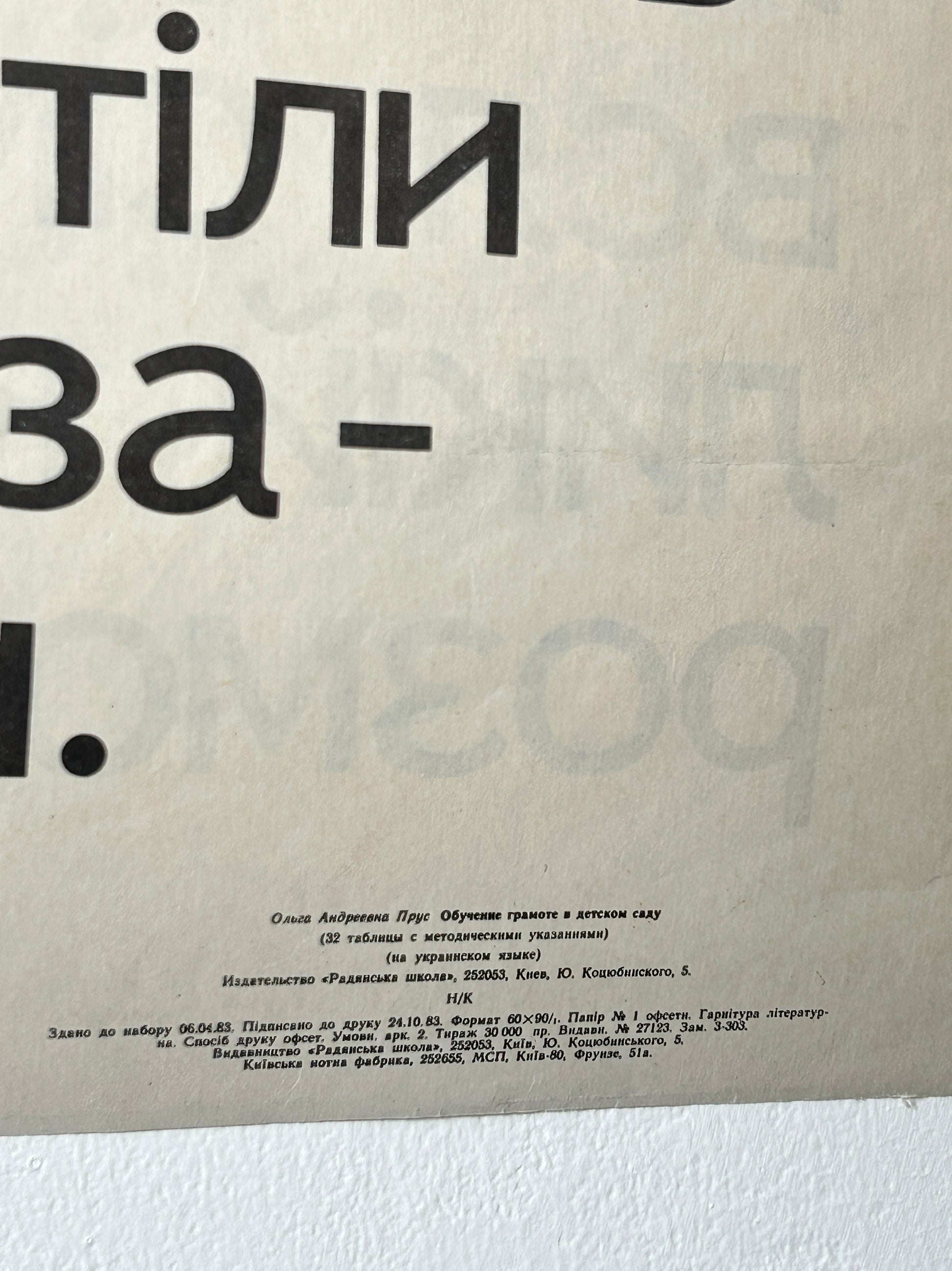 Large original double-sided Ukrainian vintage alphabet poster printed in Kyiv in 1983. A rare survivor from a time when the Ukrainian language was suppressed and replaced by Russian across the Soviet education system. This beautifully illustrated chart was used to teach the Ukrainian alphabet — a powerful artefact of cultural endurance and national identity.