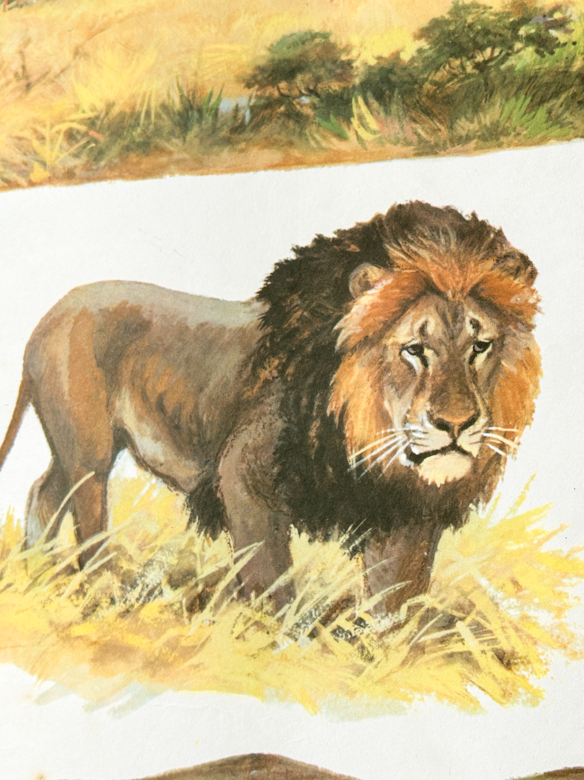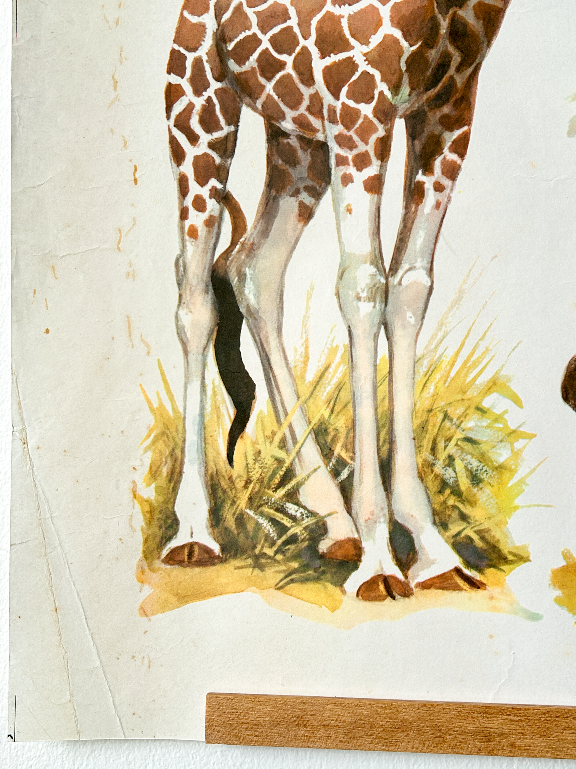 Soviet vintage educational school poster depicting the animal world of the African savanna. Geography teaching aid from the collection of a retired Ukrainian teacher. Original vintage item, 1973 design reprinted in 1985 in RSSR.